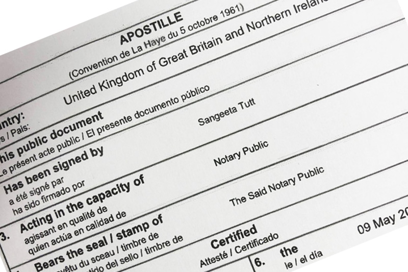 Countries that have signed up to the Hague Convention require the FCDO to attach an 'Apostille' to the document to confirm that the Notary's signature and seal is valid.